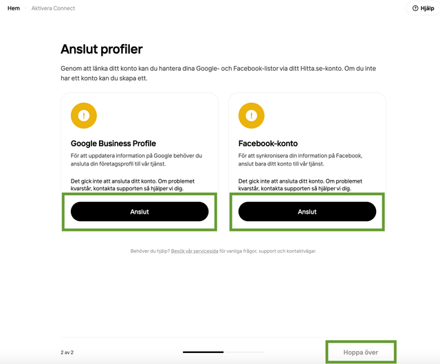 4. Efter detta godkännande kommer du in i steget att länka din Google Business Profil och ditt Facebookkonto. Klicka på "Anslut" på vardera för synkning och följ stegen (Se bild). Du kan även hoppa över detta steget om du inte har konton på någon av dessa sidor eller om du vill hantera detta senare.