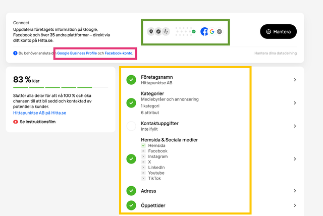 Du kan även se i "rosamarkerat" att du via här kan synka din Google Business och Facebook vid ett senare tillfälle (om du inte redan gjorde det i första stegen).