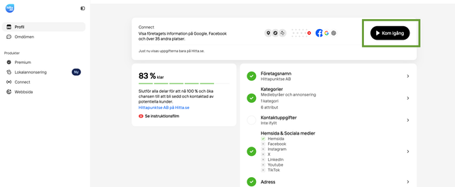 1. Inne i ditt företagskonto klickar du på "Kom igång" (Se bild).