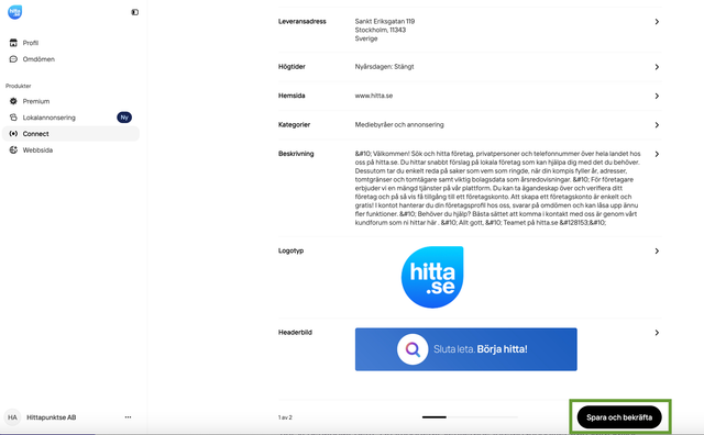 2. Efter detta behöver du/vi "Hämta data" - För att koppla ditt företag till externa plattformar behöver vi verifiera dina företagsuppgifter och få ditt godkännande för hur vi behandlar dem. Du importerar verifierade företagsuppgifter från våra källor så att vi kan hjälpa dig hålla informationen korrekt på alla plattformar genom att klicka på knappen "Hämta data" och sedan "Spara och bekräfta".